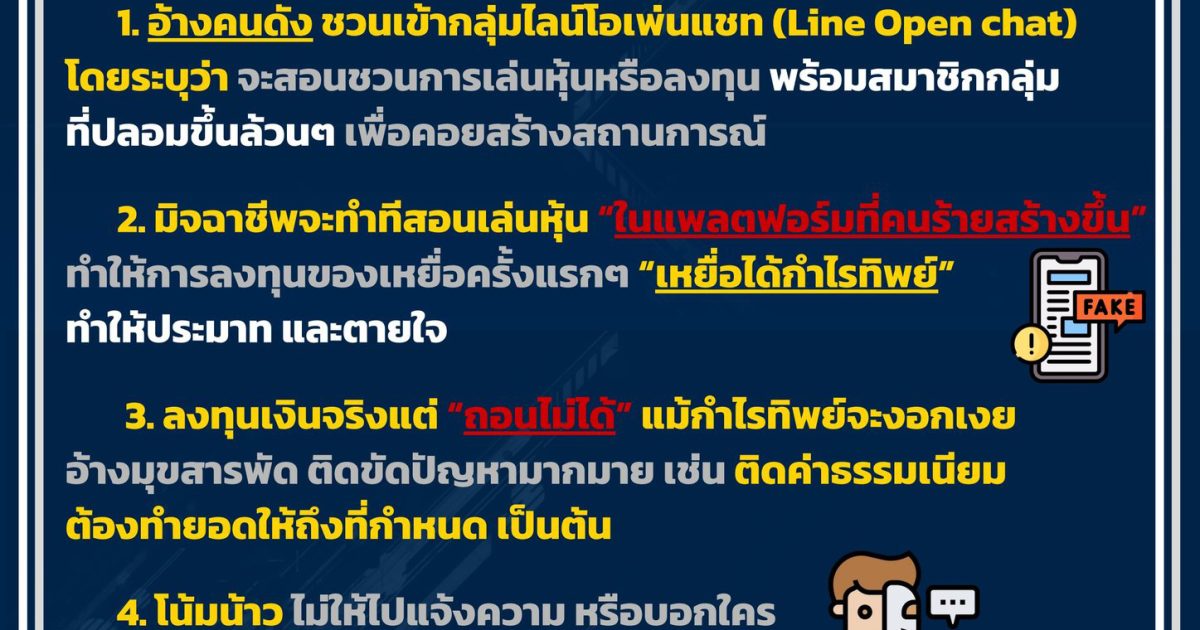 1. อ้างคนดดัง ชวนเข้ากลุ่มไลน์โอเพ่นแชท (Line Open chat) โดยระบุว่า จะสอนชวนการเล่นหุ้นหรือลงทุน พร้อมสมาชิกกลุ่มที่ปลอมขึ้นล้วนๆ เพื่อคอยสร้างสถานการณ์.