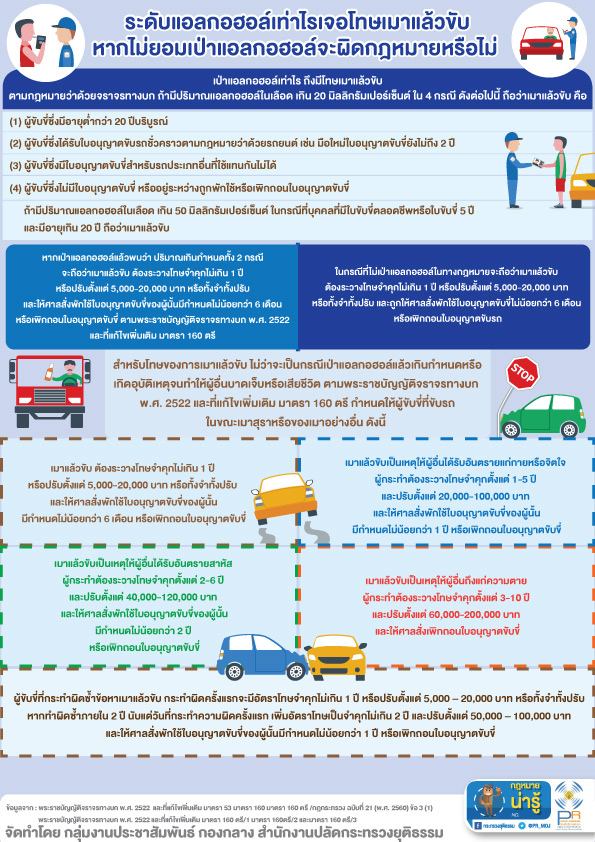 เป่าแอลกอฮอล์เท่าไร ถึงมีโทษเมาแล้วขับ ตามกฎหมายว่าด้วยจราจรทางบก ถ้ามีปริมาณแอลกอฮอล์ในเลือด เกิน 2